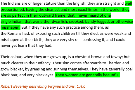 - That they are somehow ‘noble’, beautiful and “perfect in their outward frame” (Source G). This was a commonly held view of many Europeans, that Natives were pure and yet ‘simple’ in their views and behaviour.