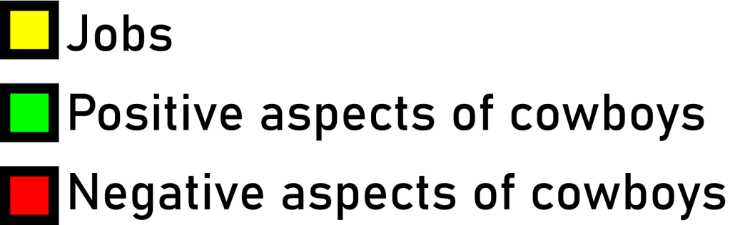 There is a lot of information about the clothing of cowboys, and also the behaviour of some cowboys in town when drunk. You can infer that many people disliked cowboys because of their raucous, riotous behaviour, causing trouble in otherwise peaceful towns. The writer says that they go around town “yelling like Comanches”, which he means as a big insult, comparing them with the Native Americans who were unpopular with white settlers. I would like to ask the writer on more specific details on how often this happened and whether it was just cowboys, as the writer suggests.